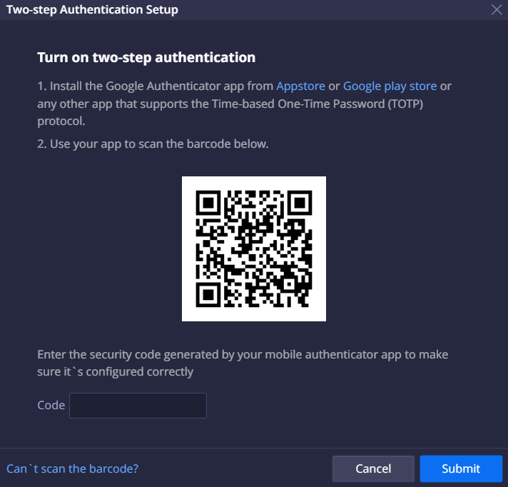 DXtrade XT now supports two-factor authentication in Web Trader to add an extra layer of security. Starting from this release, if enabled in the platform, users are offered to turn on 2FA from the main menu after they log in. Following that, they are invited to download a third-party authenticator app and scan the system-generated QR code.