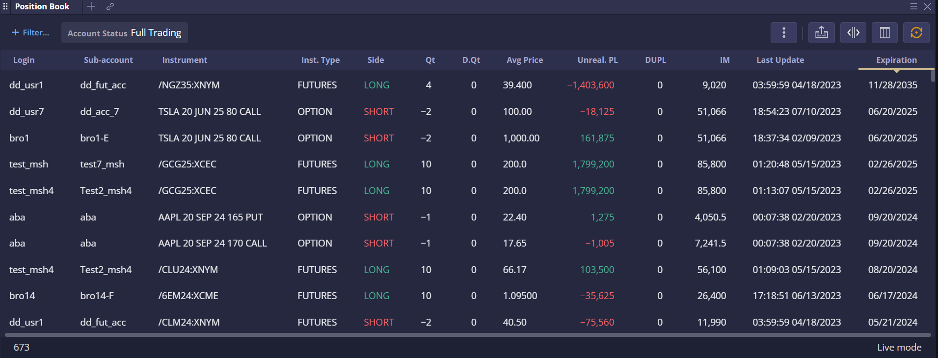 In Position Book, Expiration can be activated as a column to view instrument expiration dates or as a filter to display the instruments that expire on a selected date. In Order Book, the Expiration column shows the order expiration date.