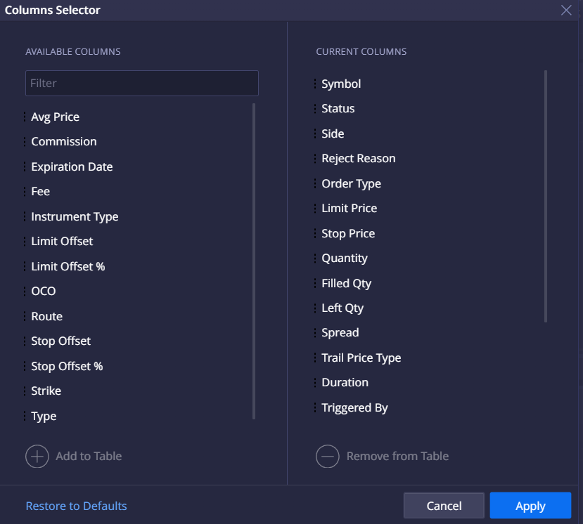 We’ve adjusted the column selector to improve the overall user experience. Now, If a trader selects a column to display in the widget, it is automatically removed from the list of available columns in the selector.